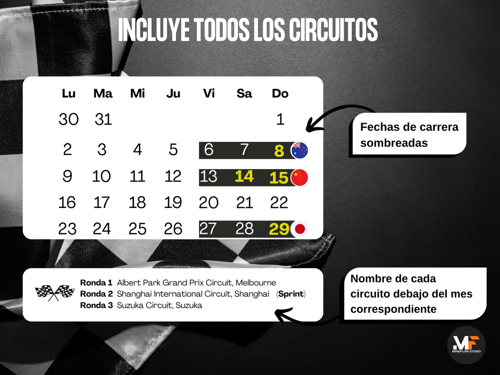 - 📍 Nombre de cada circuito debajo del mes correspondiente (ej. “Monaco GP – Monte Carlo”).